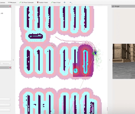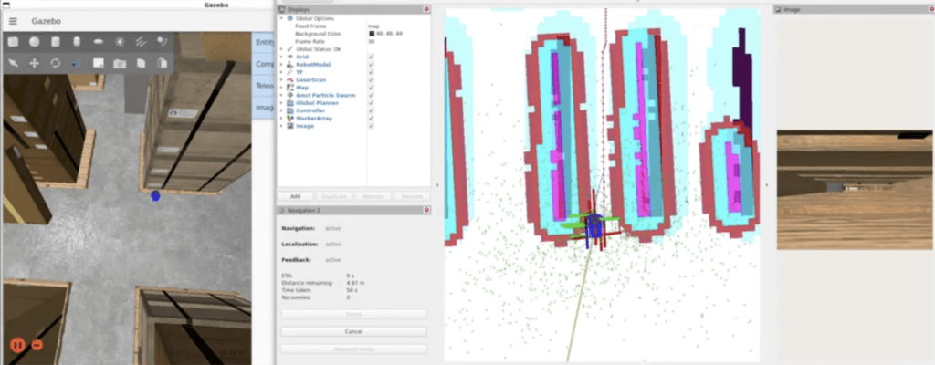 After many attempts to implement the algorithm, finally, the implementation was complete and it was time to test it out. I launched the simulation, gave the robot a pose estimate, and sent it a navigation goal through a relatively simple environment with plank obstacles scattered around. I watched the robot’s camera feed on the left and checked the map on the right with rushing excitement. The path was, indeed, generated! What a moment! It was as if I was watching Neil Armstrong step onto the Moon for the first time ever!